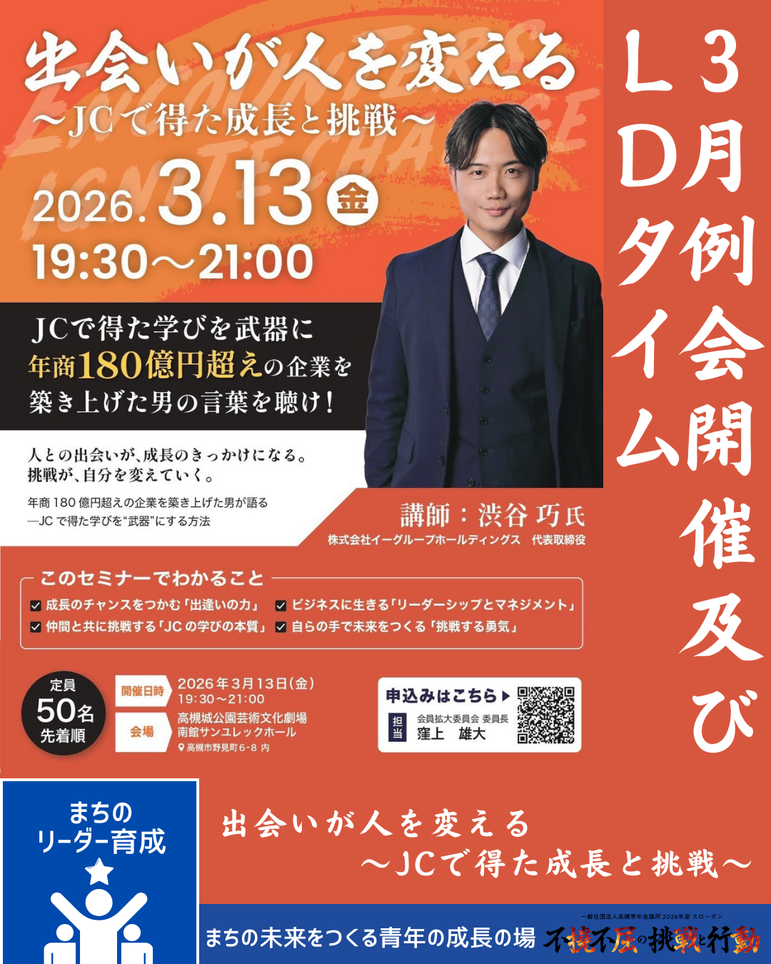 地域との協働により社会の発展に貢献する 1966年(昭和41年)10月28日に創立総会が開かれ、社団法人茨木青年会議所をスポンサーJCとして、よき環境づくり、明るい豊かなまちづくりを目指し、63名のメンバーでスタートしました。ゴールデンウィークに開催される「こいのぼりフェスタ1000」、「高槻まつり」など地域・行政が開催する各種イベントの参加や私たち自身で企画運営する講演会やイベントなどを通じて会員相互の啓発と交流をはかり、公共心を養いながら、地域との協働により社会の発展に貢献することを目的に活動しております。 理事長所信へ SCHEDULE 今後の活動予定 2026.02.18 3月例会開催及びLDタイム 出会いが人を変える〜JCで得た成長と挑戦〜 2026.02.12 2月例会開催及びLDタイム NEXT INNOVATION〜未来を切り拓く人財育成戦略〜 2026.01.14 第51回衆議院議員選挙大阪府第10区ネット討論会 2026.01.08 2026年度定時社員総会 2025.07.27 8月例会開催及び LDタイムAnswer~Beyond the Power~開催のご案内 2025.06.25 川添まつり~高槻盆DANCE伝統と文化の継承 未来に繋ぐ夏の宴~ 2025.05.27 北地域8LOM合同例会 個々の力を地域発展へ~挑戦する力と自己効力感を育む~ 開催のお知らせ 2025.05.12 6月例会開催及びLDタイム ”Re”branding Our Hometown 〜地域の魅力を、世界に通じるブランドへ〜開催のお知らせ 2025.04.07 島本町長選挙立候補予定者 ネット討論会 2025.03.11 第12回わんぱく相撲高槻場所開催のお知らせ 今後の活動予定一覧へ REPORT 過去の活動報告 2026.02.12 2026年度新年互礼会 報告 2026.01.26 第51回衆議院議員選挙大阪府第10区ネット討論会 報告 2026.01.25 2026年度定時社員総会 報告 2026.01.24 京都会議2026 参加報告 2025.10.12 全国大会佐賀大会参加報告 2025.10.12 近畿地区大会乙訓大会への参加ご報告 2025.09.28 川添まつり 高槻盆DANCE~伝統と文化の継承 未来に繋ぐ夏の宴~開催御礼 2025.09.28 9月例会及びLDタイム LOMの未来を支える拡大塾 開催のご報告 2025.09.28 8月例会及びLDタイムAnswer~Beyond the Power~開催のご報告 2025.06.25 6月事業 姉妹交流事業「Power」開催のご報告 過去の活動報告一覧へ MESSAGE 理事長メッセージ ABOUT 青年会議所とは NEWS お知らせ 2026年02月18日 事業案内 3月例会開催及びLDタイム 出会いが人を変える〜JCで得た成長と挑戦〜 2026年02月12日 事業案内 2月例会開催及びLDタイム NEXT INNOVATION〜未来を切り拓く人財育成戦略〜 2026年02月12日 過去の活動報告 2026年度新年互礼会 報告 2026年01月26日 過去の活動報告 第51回衆議院議員選挙大阪府第10区ネット討論会 報告 2026年01月25日 過去の活動報告 2026年度定時社員総会 報告 お知らせ一覧へ 姉妹JC JCI Singapore City JCI Bali JCI Ubud-Bali