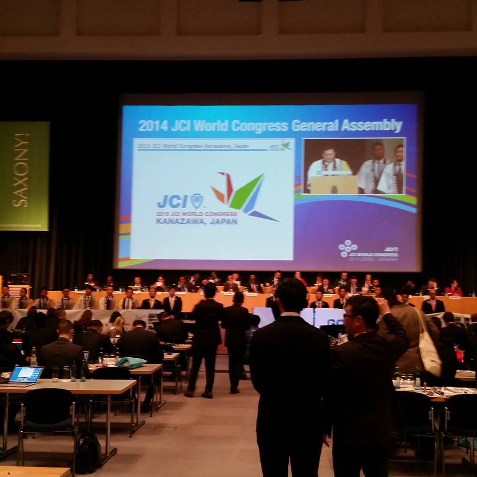 総会1です。先月バリ島に行ったにお会いしたインドネシアの次期会頭が大きな声で「Takatuki!」と叫んで探してくれました。この時は写真取れませんでしたが、ジャパンナイトでまたであった時に国際アカデミーの開催地半田JCの近藤理事長と撮りました。場所: CCL Leipzig