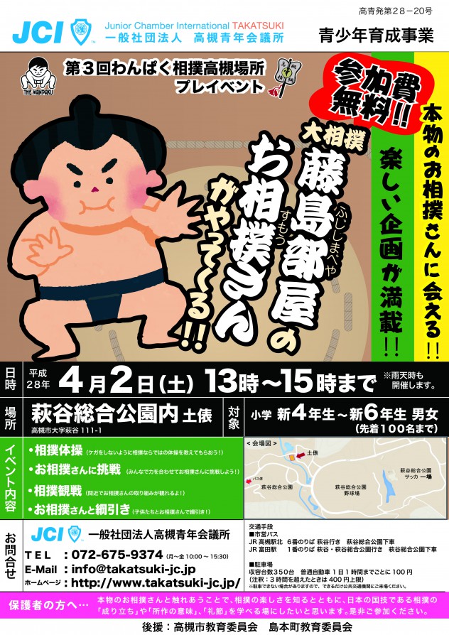 来る5月28日第3回わんぱく相撲高槻場所が開催されます。 わんぱく相撲とは、相撲を通して勝った時の感動する気持ちや負けた時の悔しさを乗り越える経験をすることで、子供達の「素直で豊かな強い心」を育むことを目的として、全国的に開催されているイベントです。 今回は第3回わんぱく相撲高槻場所のプレイベントとして、大相撲大阪場所において高槻で部屋を構えておられる「藤島部屋」のお相撲さんをお招きして、イベントを企画させていただきました。 イベントでは子供達みんなでお相撲さんに挑戦したり、お相撲さんと綱引きをしたりと楽しい企画が満載です。 参加費は無料です。是非ご参加ください。 日時:2016年4月2日(土)13:00~15:00 ※雨天決行 場所:萩谷総合公園 対象:小学新4年生~新6年生の男女(先着100名)