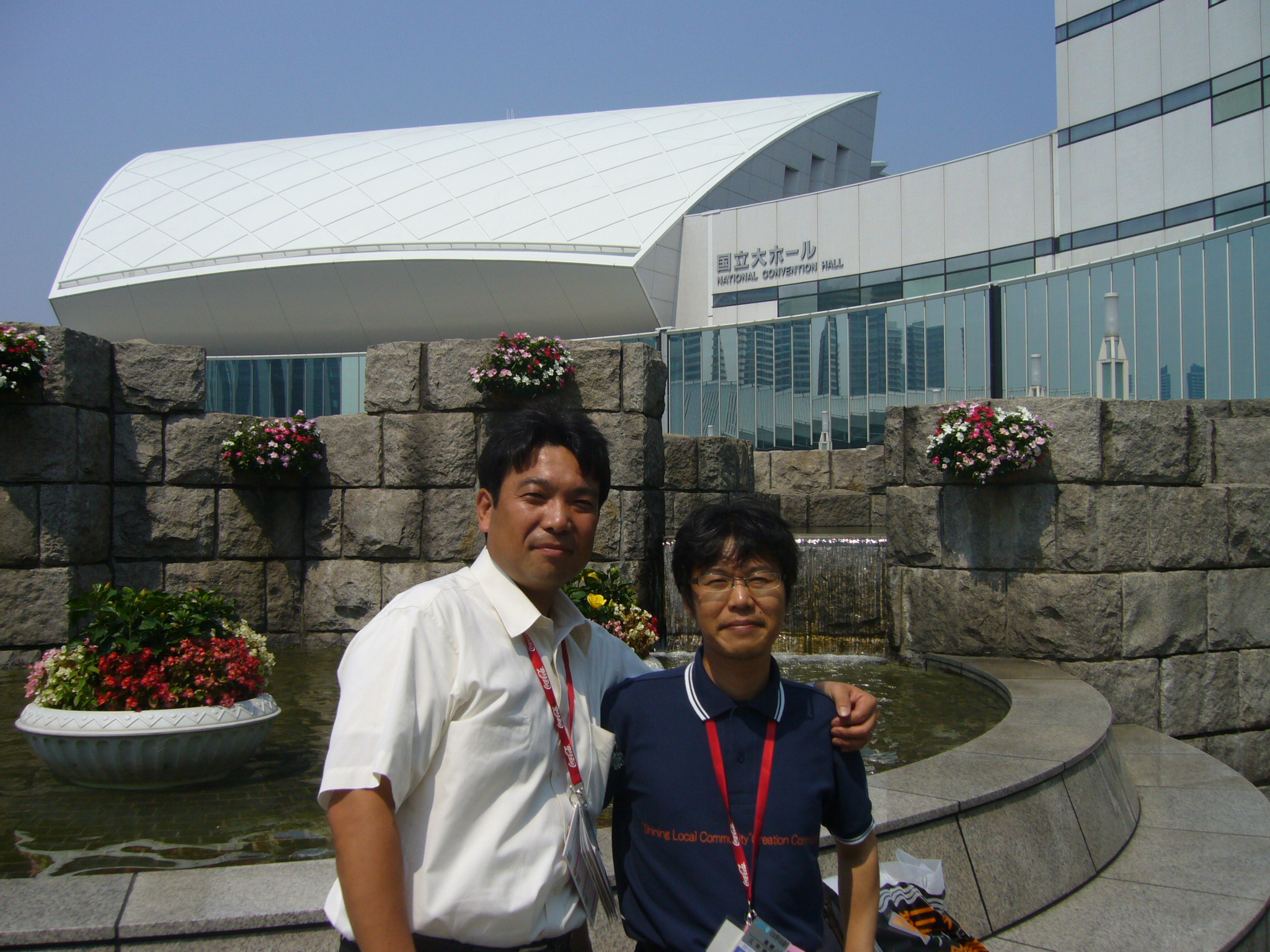 横浜で頑張っていただいている久米君と再び外に出て網島専務理事に写真を撮っていただきました。後ろに移っているのが今回の会場の一つ国立大ホールです。
